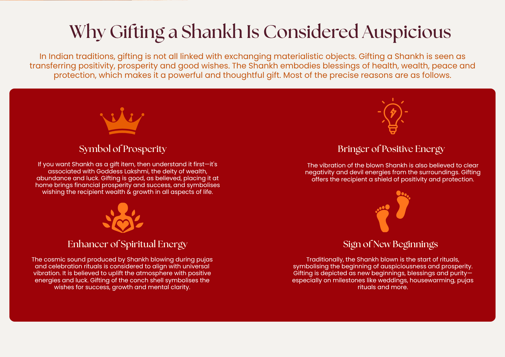 If you want Shankh as a gift item, then understand it first—it’s associated with Goddess Lakshmi, the deity of wealth, abundance and luck. Gifting is good, as believed, placing it at home brings financial prosperity and success, and symbolises wishing the recipient wealth & growth in all aspects of life.