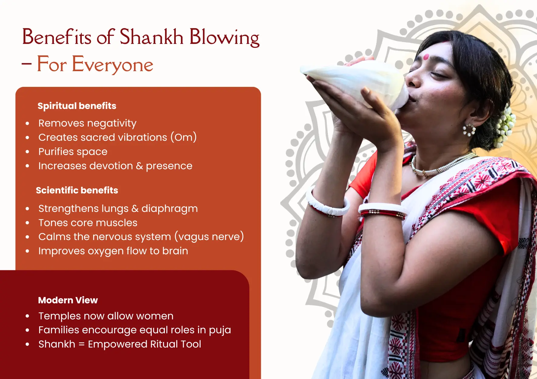 - Mental clarity—shankh blowing helps increase oxygen levels and supports brain health.