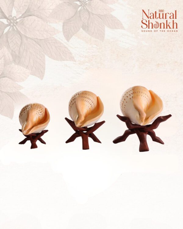 - A wooden stand ensures that the Shankh is respectfully placed, following spiritual customs and Vastu principles. Wood has been historically chosen for stands due to its natural, sacred, and grounding energy.