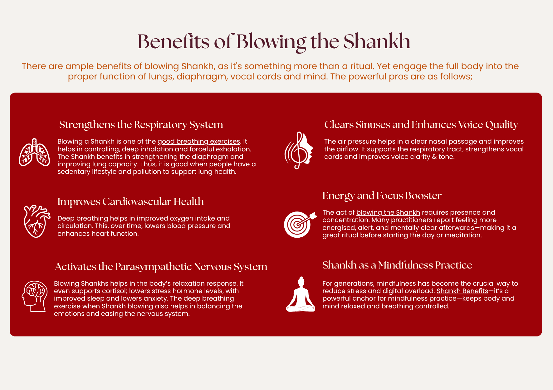 The Shankh benefits include strengthening lungs, improving breathing, boosting focus, cleansing energy, supporting digestion, and attracting positive vibrations.