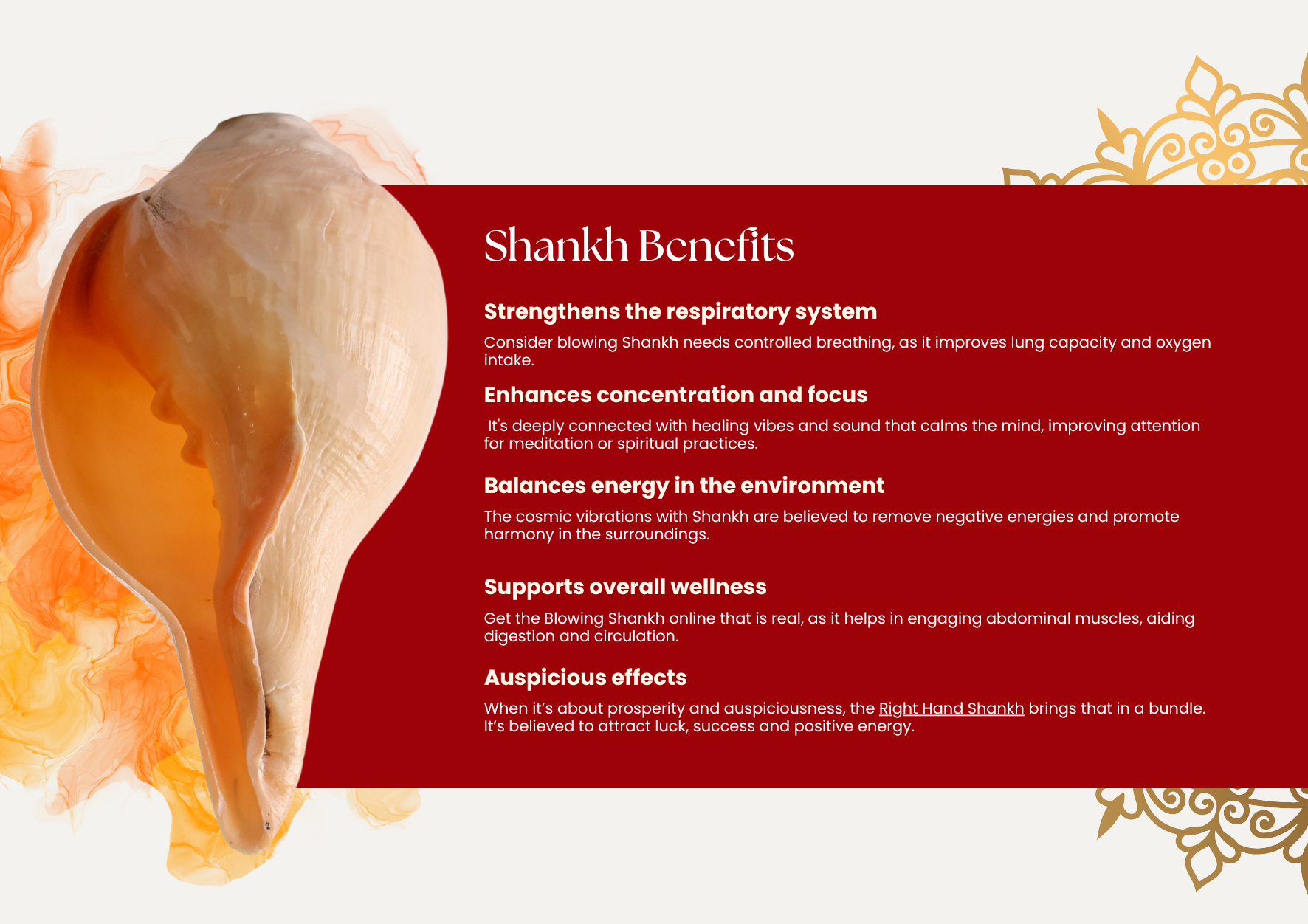 The act of blowing the Shankh requires presence and concentration. Many practitioners report feeling more energised, alert, and mentally clear afterwards—making it a great ritual before starting the day or meditation.